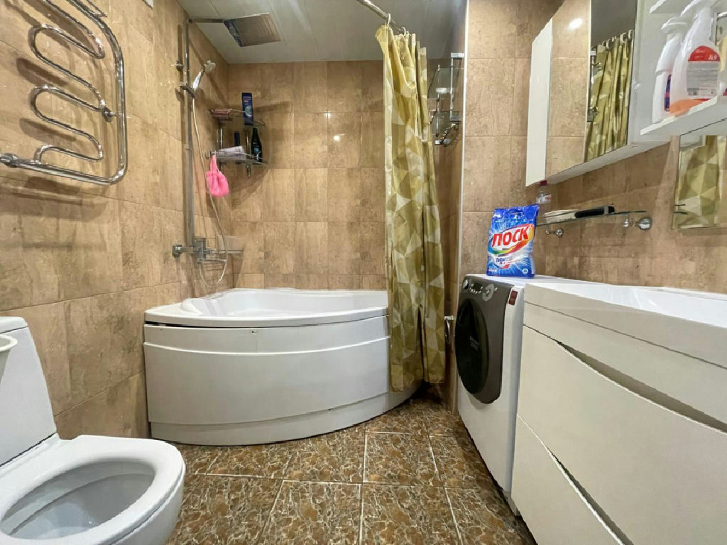 Общая площадь квартиры 53 м2. Трёхкомнатная квартира по документам. Сделано ПРОДУМАННОЕ ЗОНИРОВАНИЕ пространства. Просторная кухня совмещенная с гостиной 21 м2.В кухне установлен гарнитур со всей необходимой бытовой техникой (газовая плита, холодильник, посудомойка, вытяжка...). Спальня 15 м2 с выходом на застеклённый балкон. Детская комната 10 м2. Просторный совмещенный санузел